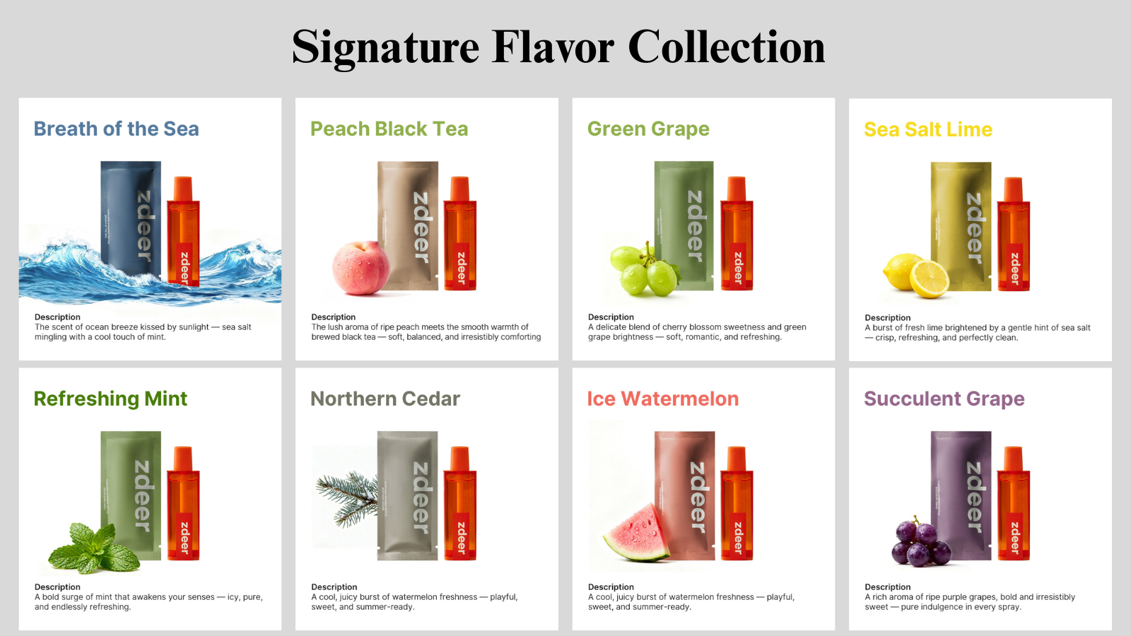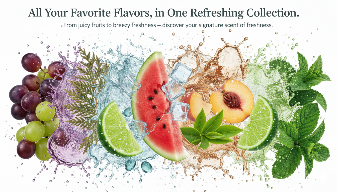 All-Flavors 8-Pack Includes: Succulent Grape, Green Grape, Northern Cedar, Breath of the Sea, Peach Black Tea, Sea Salt Lime, Ice Watermelon, Refreshing Mint